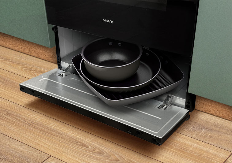 To przemyślane rozwiązanie, doceni każdy miłośnik porządku i funkcjonalności. Umieszczony w dolnej części urządzenia otwierany schowek, doskonale nadaje się do przechowywania patelni, pokrywek, form do pieczenia oraz innych przydatnych akcesoriów. To dodatkowa, łatwo dostępna przestrzeń, dzięki której organizacja kuchni staje się prostsza, a gotowanie jeszcze bardziej komfortowe.