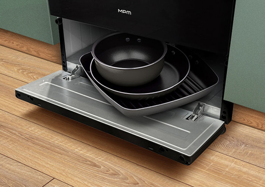 To przemyślane rozwiązanie, doceni każdy miłośnik porządku i funkcjonalności. Umieszczony w dolnej części urządzenia otwierany schowek, doskonale nadaje się do przechowywania patelni, pokrywek, form do pieczenia oraz innych przydatnych akcesoriów. To dodatkowa, łatwo dostępna przestrzeń, dzięki której organizacja kuchni staje się prostsza, a gotowanie jeszcze bardziej komfortowe.