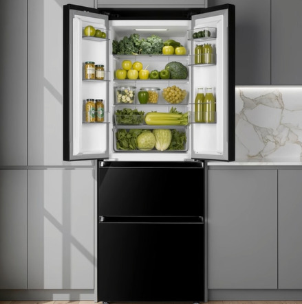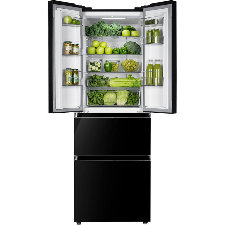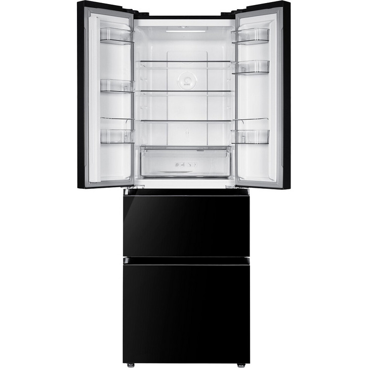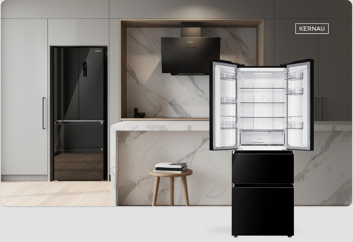 Czarna lodówka Kernau z układem French Door ma dwuskrzydłową chłodziarkę u góry i pojemne szuflady zamrażarki na dole. Dwuskrzydłowa chłodziarka na górze daje szybki dostęp do świeżych produktów, a pojemne szuflady zamrażarki na dole pozwalają łatwo posegregować zapasy – wszystko ma tu swoje miejsce, dokładnie tam, gdzie tego potrzebujesz.