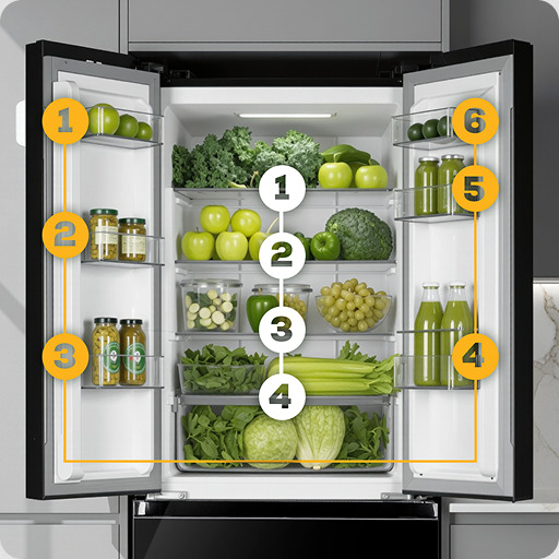 W części chłodzącej znajdziesz cztery szerokie półki z hartowanego szkła oraz sześć praktycznych balkoników na drzwiach – to funkcjonalny układ, który ułatwia przechowywanie produktów, od butelek i słoików, po nabiał czy sosy. Dodatkowo, specjalny pojemnik na warzywa i owoce pomaga utrzymać optymalną wilgotność, dzięki czemu świeże produkty zachowują smak, konsystencję i wartości odżywcze na dłużej.