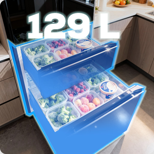 Pojemna zamrażarka 129 L w lodówce to więcej miejsca na mrożonki i domowe zapasy. Przemyślane wnętrze z praktycznymi szufladami ułatwia organizację i szybki dostęp do produktów. To wygoda na co dzień i oszczędność czasu dla całej rodziny.
