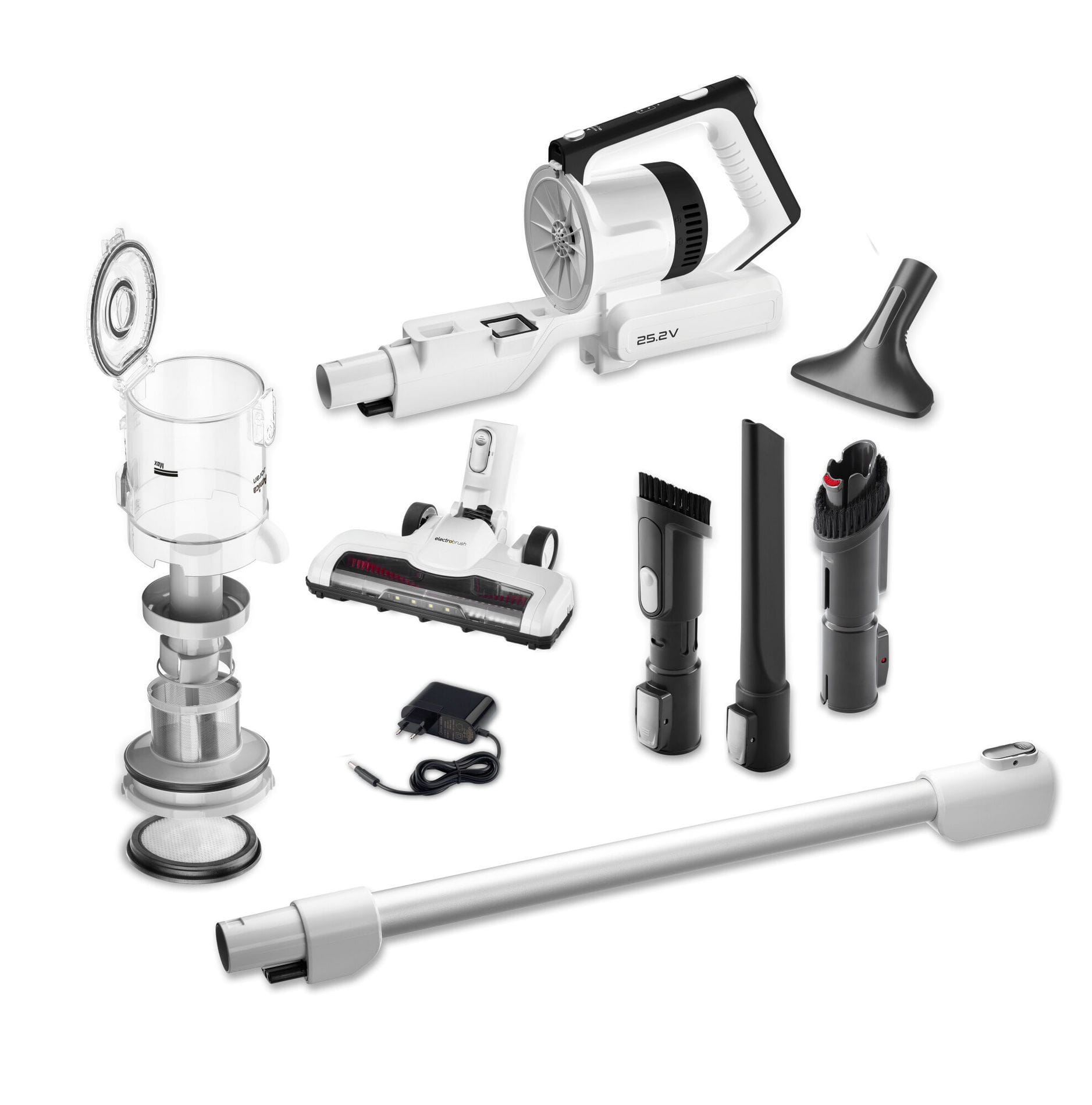 | Dodatkowe informacje | Pionowy 2 w 1,Filtr EPA 10,Bezprzewodowa praca,Zabezpieczenie silnika,Wieszak na odkurzacz i akcesoria,Miękkie ciche koła,Elektroniczna regulacja mocy,Podświetlenie LED elektroszczotki,Ergonomiczny uchwyt i przyciski,Zabezpieczenie baterii przed przegrzan |