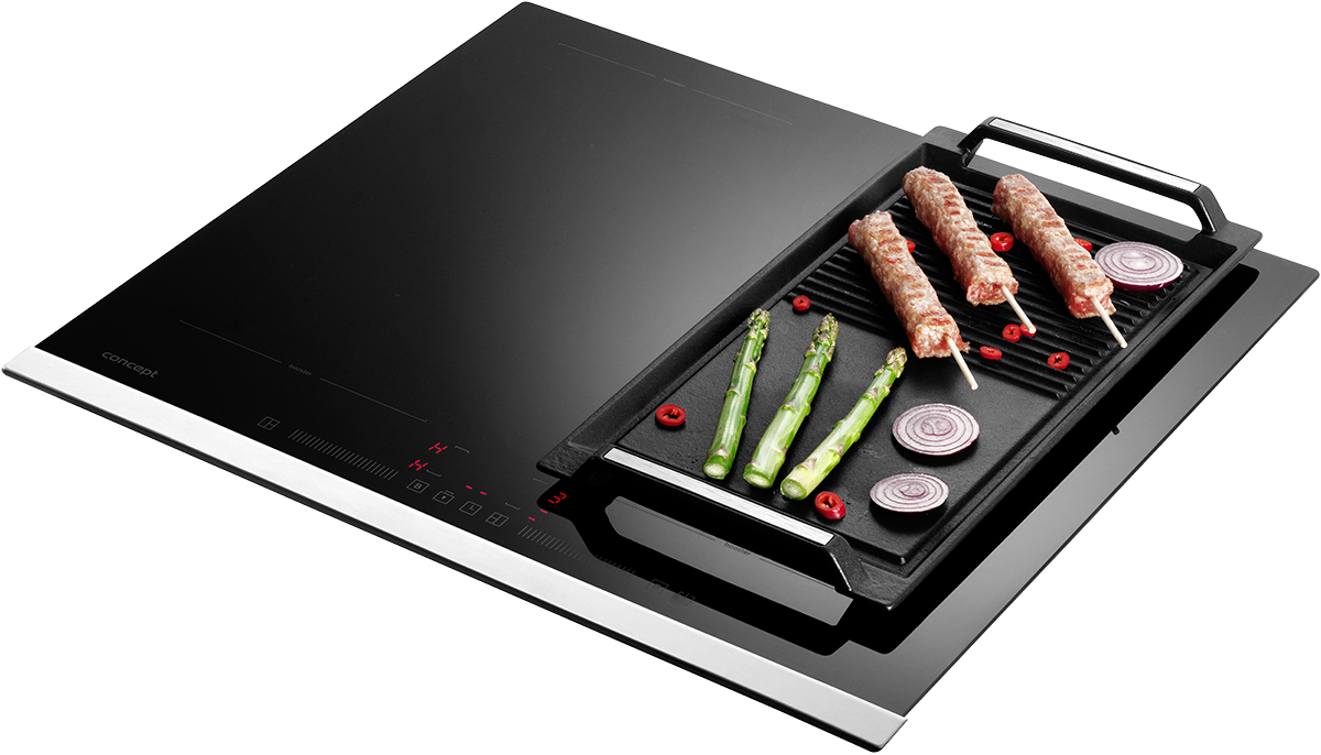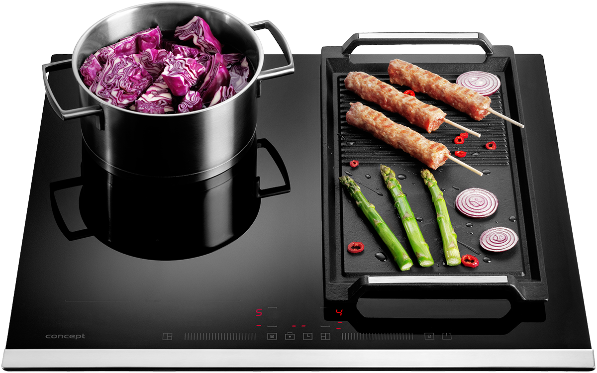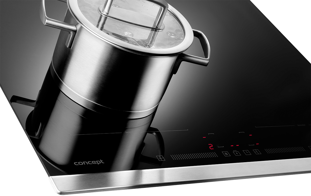 Flexi strefa (Bridge) w płycie indukcyjnej IDV5760 pozwala połączyć dwa oddzielne pola grzewcze w jedno duże. Ta funkcja jest idealna do gotowania w większych garnkach, brytfannach lub grillowych patelniach, które nie zmieściłyby się na standardowym polu grzewczym. Strefę Bridge można aktywować zarówno po lewej, jak i po prawej stronie płyty.