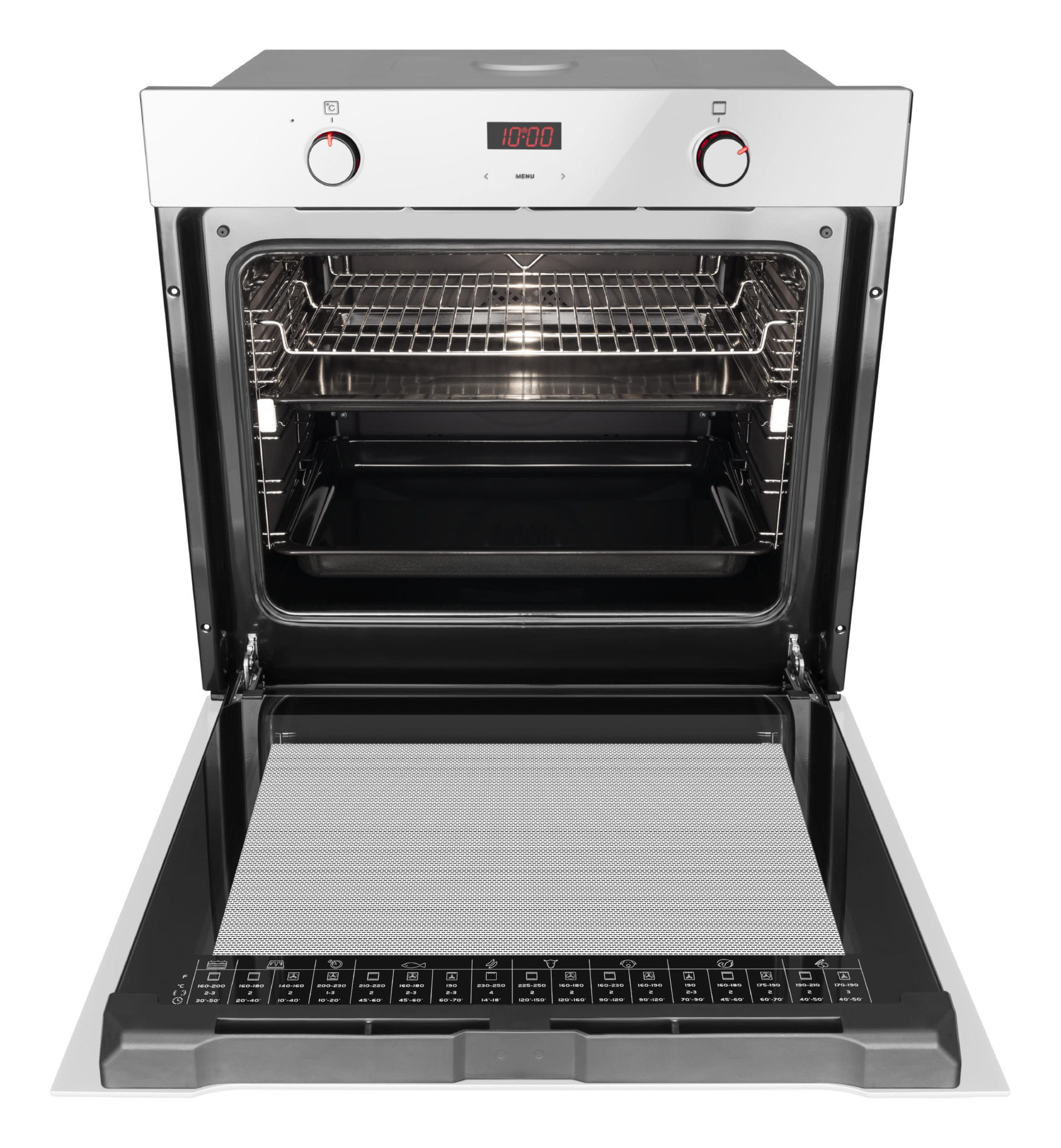 Przepisy znajdujące się na wewnętrznej stronie drzwi piekarnika to praktyczny poradnik w zasięgu ręki – zawiera informacje o rodzaju potrawy, temperaturze, poziomie oraz czasie pieczenia.