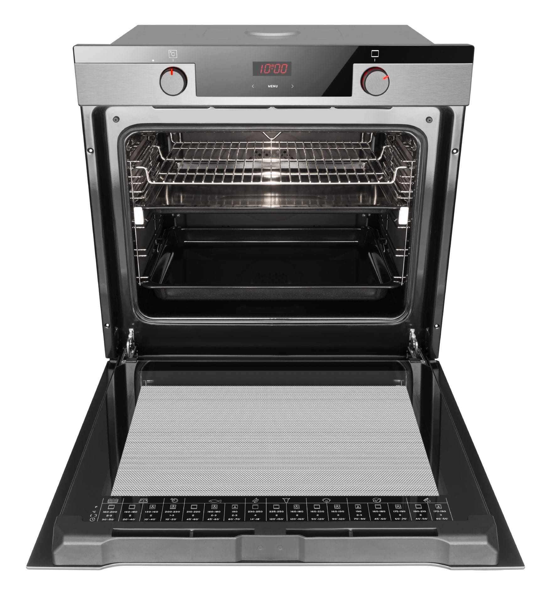 Przepisy znajdujące się na wewnętrznej stronie drzwi piekarnika to praktyczny poradnik w zasięgu ręki – zawiera informacje o rodzaju potrawy, temperaturze, poziomie oraz czasie pieczenia.