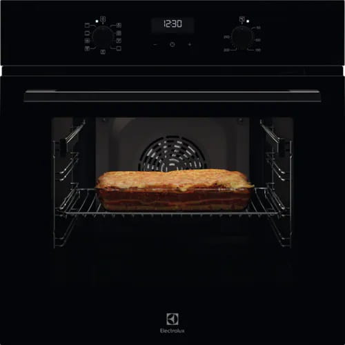 Wyświetlacz LED pokazuje czas rzeczywisty, a w trakcie pracy piekarnika można także ustawić alarm oraz czas zakończenia pieczenia, co ułatwia obsługę, gdy wykonujemy kilka czynności jednocześnie np. przygotowując kolację.