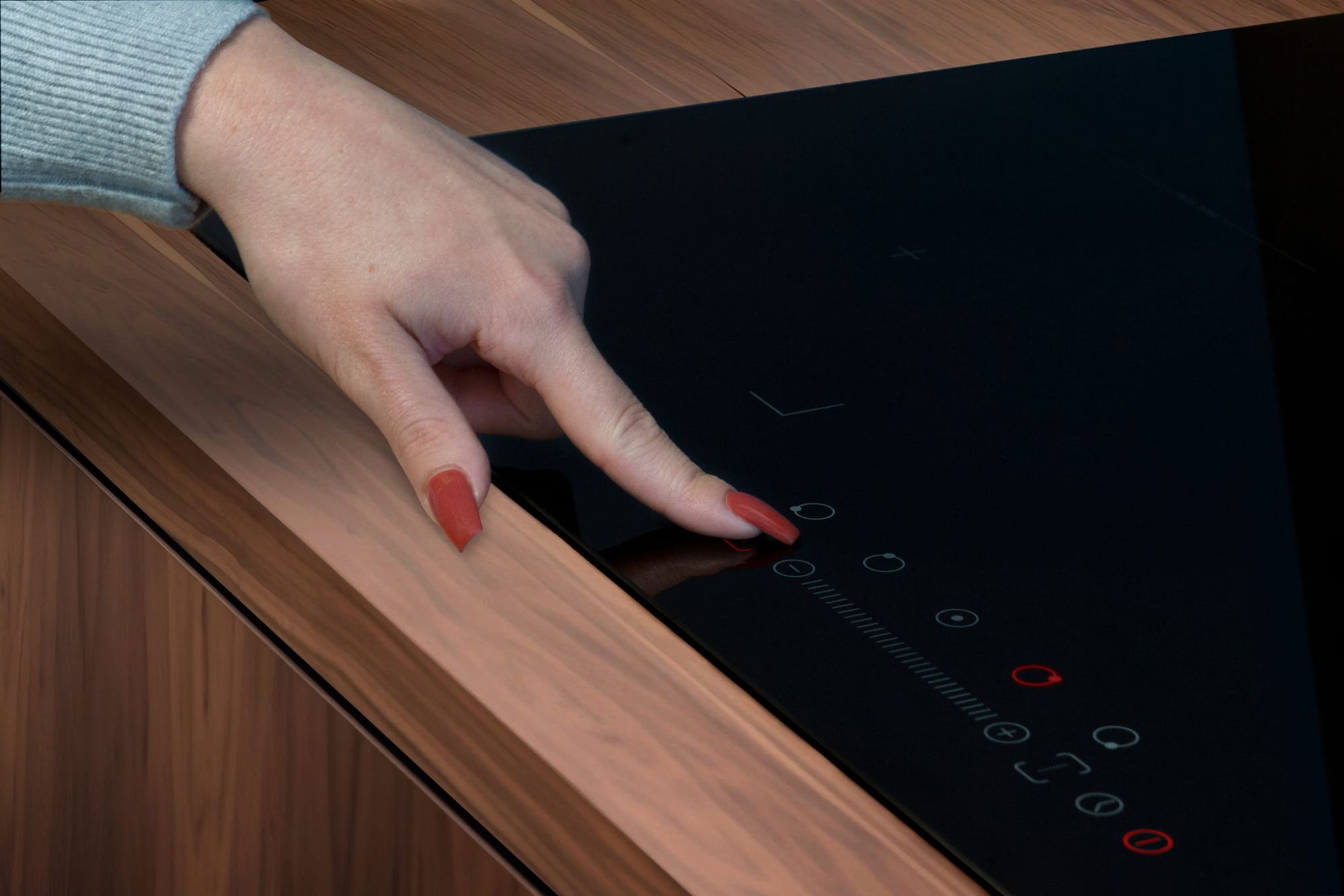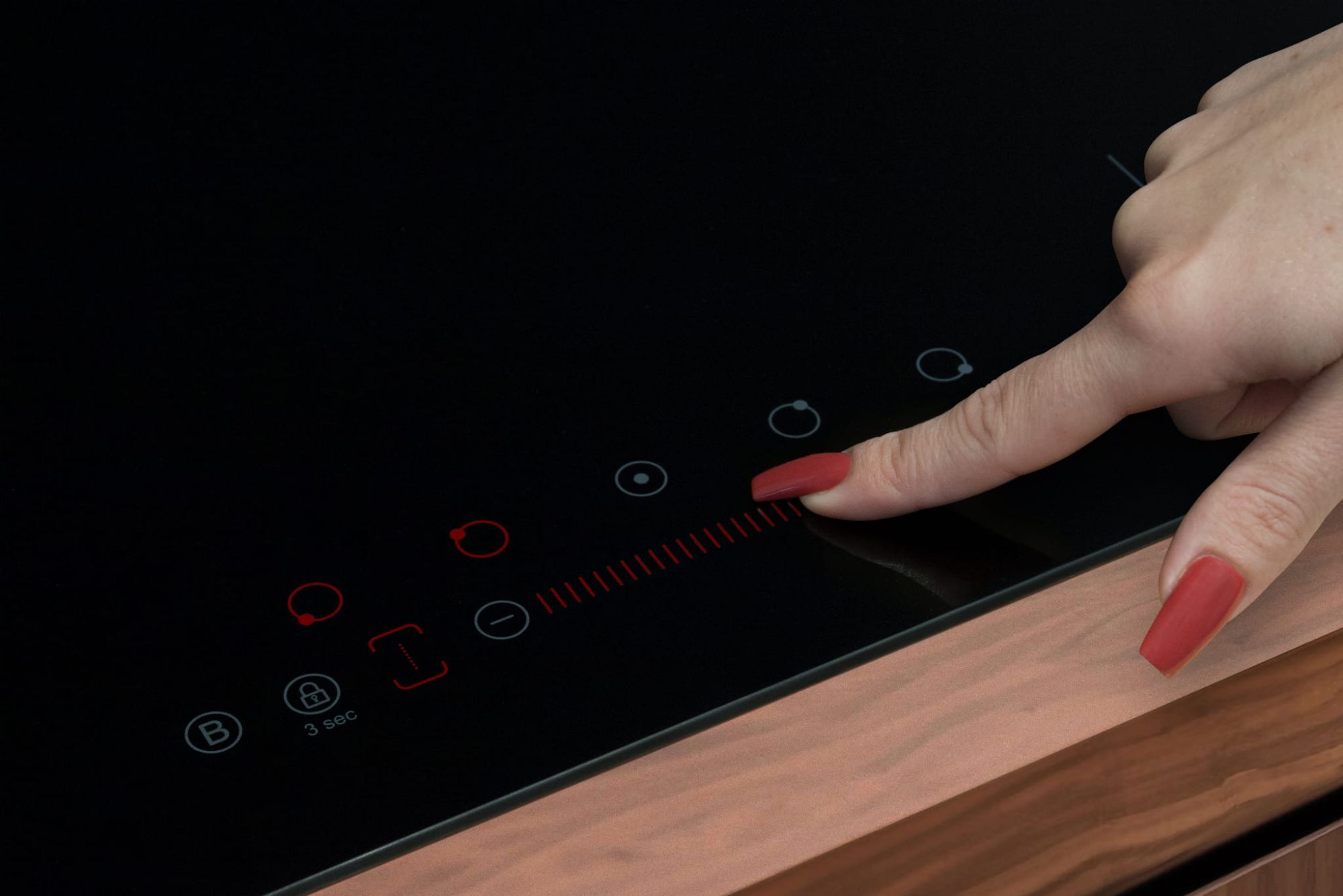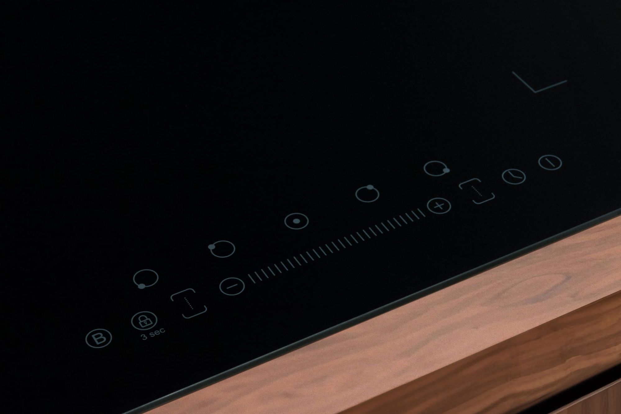 Na panelu sterowania płyty można znaleźć informacje o aktywnych polach grzewczych oraz ich mocy. W pobliżu znajdują się też wskaźnik i przycisk timera, suwak oraz przycisk do zwiększania mocy Booster, przycisk blokady funkcji, a także włączania i wyłączania płyty.