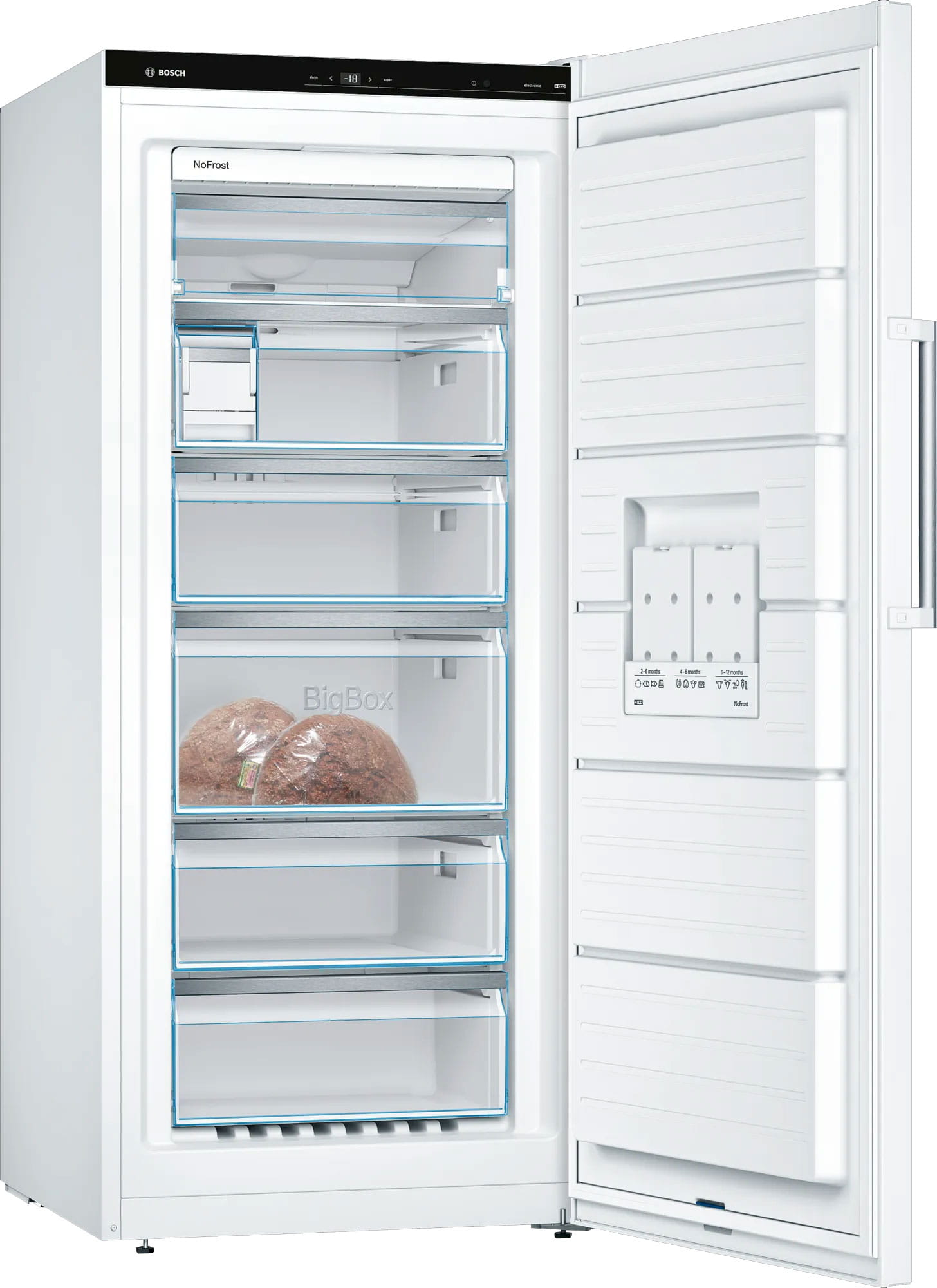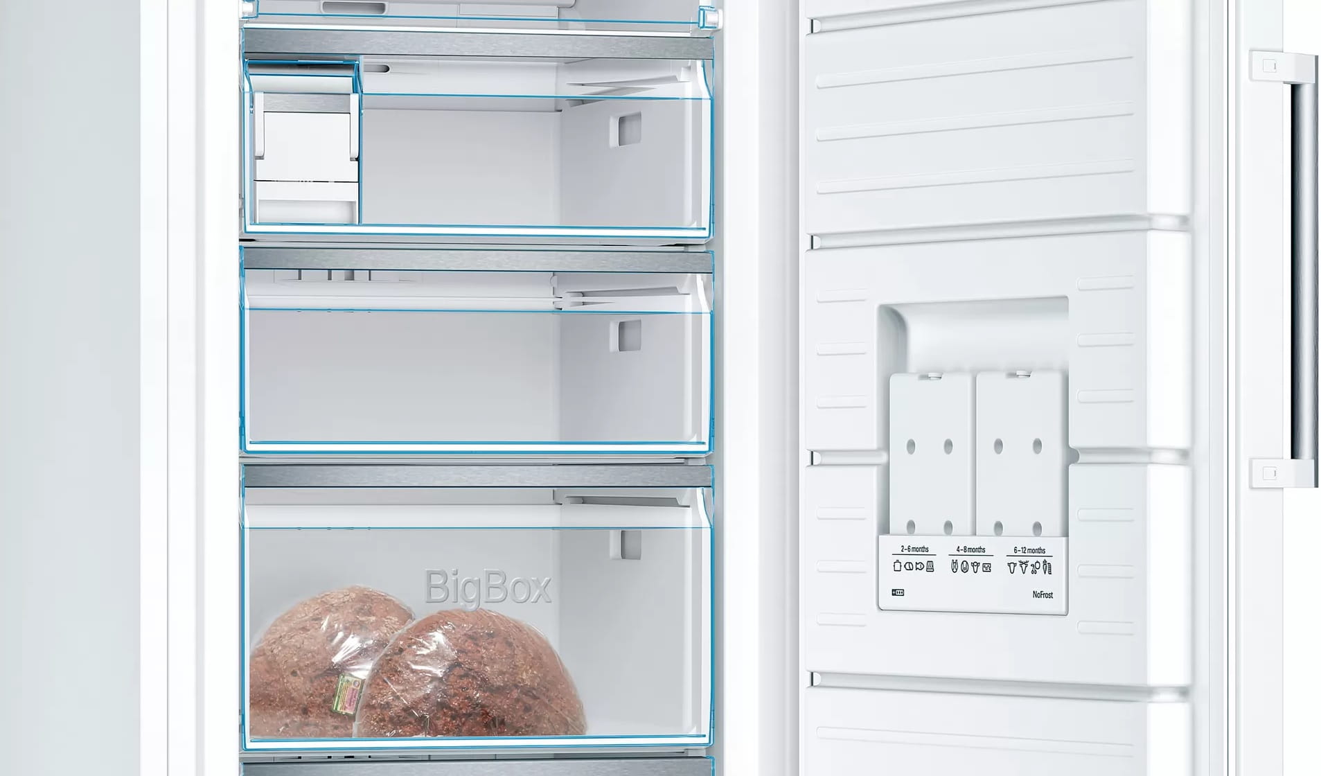 Oto wyjątkowo głęboka szuflada na produkty mrożone, umożliwiającą wygodne układanie pojemników lub dużych porcji mrożonej żywności, jak np. tort czy pizza. Nieważne, czy musisz zaopatrzyć się na urodziny dla dziecka czy zamrozić tort weselny — szuflada Big Box zapewni wystarczająco dużo miejsca nawet na duże porcje.