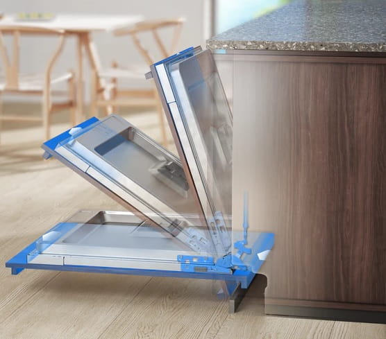 Prowadnice ComfortRails zapewniają płynne wysuwanie się koszy zmywarki. Jednocześnie zapobiegają chybotaniu i obijaniu się o siebie zawartości koszy, dzięki czemu chronią delikatne naczynia. Dodatkową korzyścią jest cichsza obsługa zmywarki.