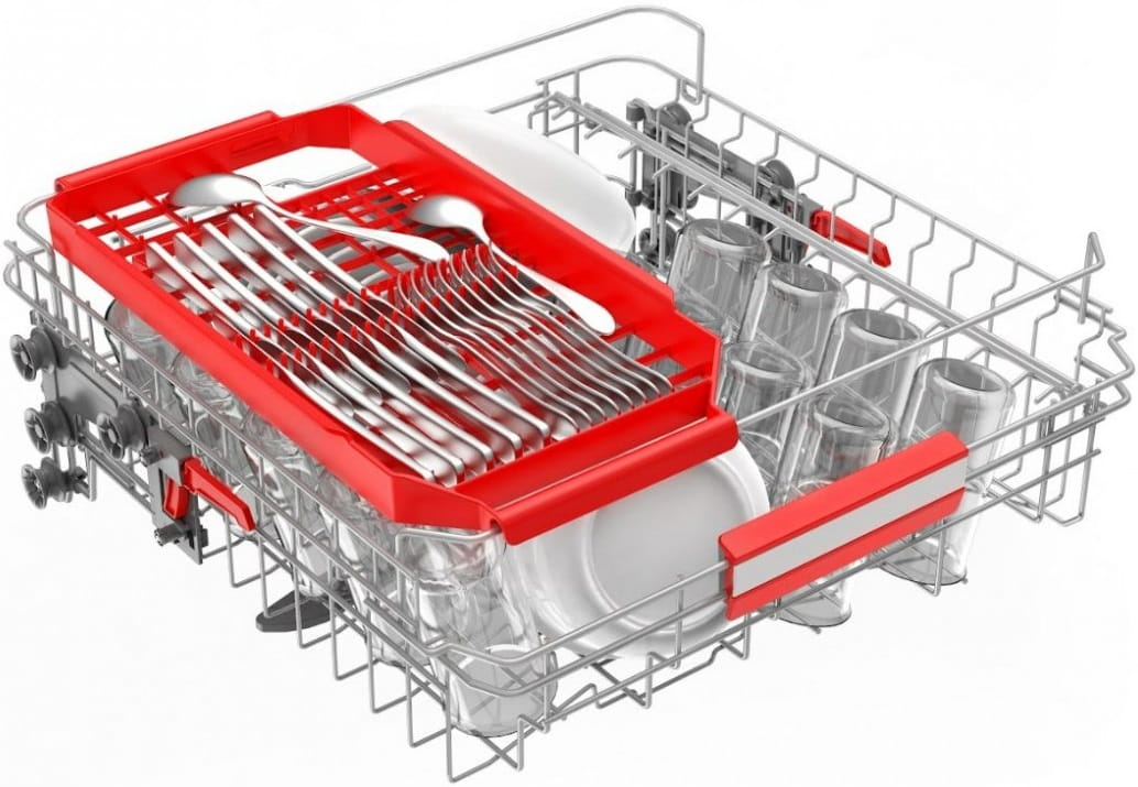 Chodzi o to, czego potrzebujesz. Funkcja przesuwanej tacy w zmywarce Toshiba umożliwia przesuwanie tacy na boki, jeśli potrzebujesz więcej miejsca, dzięki czemu masz więcej miejsca na wygodne umieszczenie wysokich szklanek, przechowywanie widelców i noży oraz ładowanie mniejszych kubków i chochli na tacy.